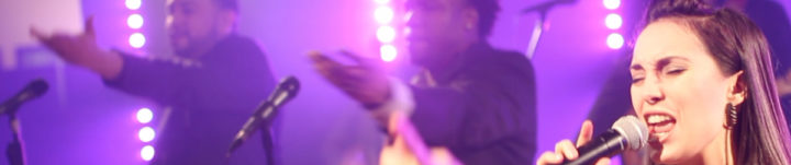 A woman sings into a microphone on stage with two backup dancers performing in the background, illuminated by purple stage lights, as part of a lively Boston wedding band.